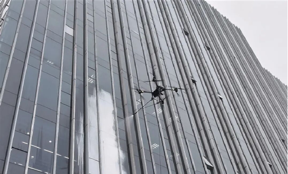 无人机“飞哥”是唯一会飞行的“新同事”,正是基于这种强大的本领,主要负责大楼外立面玻璃墙体的清洁任务。
