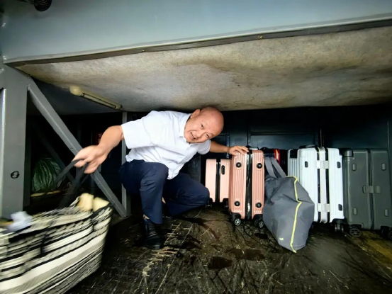 驾驶员屈克斌钻进后备箱为游客搬运行李